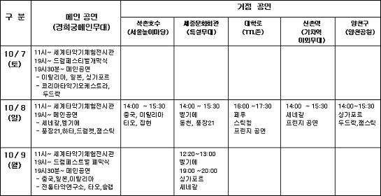 메인무대인 ‘경희궁’에서는 페스티벌 기간인 7~9일 오후7시~9시30분에 공연이 이어지고, 지역별로는 세종문화회관 중앙계단에 마련된 특설무대에서 8~9일에, 송파서울놀이마당, 대학로, 신촌역, 양천구 양천공원에서 8일 개최된다. 또 7일과 9일, 서울의 번화가를 중심으로 게릴라 콘서트가 열릴 예정이서, 시민들에게 축제의 즐거움을 한껏 더 안겨줄 예정이다. 그런가 하면 올해에는 온라인 드럼 동호회의 신청을 받아 선정된 4개팀이 국내외 전문 공연팀과 함께 무대에 올라, 아마추어팀과 국내외 프로팀이 하나되어 즐기는 진정한 프린지 공연이 되도록 했다. 부대행사 또한 공연만큼이나 풍성하다. 경희궁에서는 1,000여종의 타악기를 둘러볼 수 있는 ‘세계 타악기 체험관’과 ‘국악기 체험관’을 운영한다. 체험관에서는 라틴 타악기, 국악 민속악기, 오케스트라 타악기 등을 직접 체험할 수 있으며, 우리가 무심코 지나쳤던 쓰레기통, PVC 파이프, 냄비 뚜껑 등의 생활용품과 폐자재들이 어떠한 소리와 리듬을 만들어 내는지 알아보고, 생활주변의 여러 가지 재료를 사용해서 타악기를 직접 만들어 세상에서 유일한 나만의 타악기를 아이들과 함께 만들어 연주해 볼 수 있다. 자세한 공연일정과 상세한 출연진 정보는 홈페이지(www.drumfestival.org)를 참조하면 된다. 문의 : 서울드럼페스티벌 사무국 ☎ 734-1695~6 www.drumfestival.org