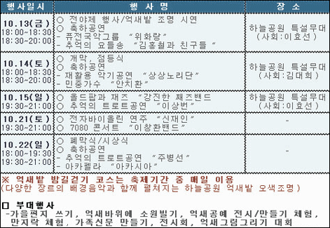 13일부터 억새축제 개막 억새가 만발한 월드컵공원은 도심에서 가을을 만끽할 수 있는 최적의 장소. 하늘공원 5만8,000평 가운데 약 3만평에 조성된 억새밭은 10월 들어 가을 정취가 한창 무르익었다. 낮시간대에는 억새풀 공예 전시와 만들기 체험, 가을 편지 쓰기 행사 등과 함께 난지도 사진 전시 행사도 마련된다. 한편 축제 기간동안에는 개방시간을 기존 오후 7시에서 오후 10시로 연장한다. 입장은 오후 9시까지 가능하다. 개막행사는 축제 둘째날인 14일 오후 6시에 오세훈 시장 등이 참석한 가운데 펼쳐질 예정이며, 오색등 점등식과 축하공연이 이어진다. 상암동 월드컵공원을 찾아가려면 지하철 6호선 월드컵경기장역 1번 출구나 버스 171, 271, 571, 7011, 7013, 7714, 7715번을 이용하면 된다. 축제에 대한 자세한 사항은 월드컵공원 관리사업소(☎ 300-5500~2)나 홈페이지(http://worldcuppark.seoul.go.kr)를 참고하면 된다. 문의 : 월드컵공원 관리사업소 ☎ 300-5500~2