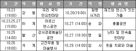 10월20일~29일 121개 역사에서 개최 퇴근길 지하철 타러 가는 발걸음이 가볍다. 서울도시철도공사는 이달 29일까지 121곳의 지하철 역사에서 ‘시민과 함께 행복한 5678 서울도시철도 가을 문화축제’를 개최한다. 지난 20일부터 시작된 축제에는 지역 주민들이 직접 제작한 작품 전시를 비롯 연주회, 체험 행사를 비롯 다양한 공연이 펼쳐지고 있다. 23일 오후 6시 중화역에서 ‘어린이 악단 연주회’를 비롯 육사 군악대 연주회, 장애우 합창공연 등의 음악 연주회 및 거리마술공연, 어르신 댄스공연 등 공연한마당이 하계역, 강동역 등에서 펼쳐진다. 캐릭터 공모작, 사랑의 편지 등 전시회도 85곳의 역사에서 125회 개최되는 한편 건강검진, 이ㆍ미용 행사, 가훈 써주기 등의 무료 체험 행사도 진행된다. 이외에 전통차 나누기, 주민 화합 탁구대회, 전통공예품 만들기 등 사랑 나눔 바자회가 38곳의 지하철역사에서 펼쳐지고 있다. 한편 축제와 관련 서울도시철도공사 관계자는 “올해로 11번째 개최되는 도시철도 가을문화축제는 지하철 역사를 시민들에게 축제의 마당으로 제공, 지역 주민이 직접 행사를 기획, 진행하는 한편 무대의 주인공이 되는데 의미를 두고 진행하고 있다”고 밝혔다. ■ 문의: 서울도시철도공사 ☎ 02-6311-2132~3, 홈페이지 www.smrt.co.kr