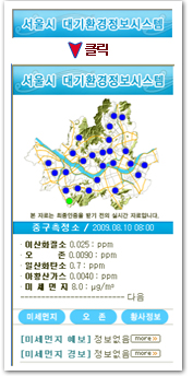 또한, 앞으로 누구든지 자신의 홈페이지에 삽입해 서울시 대기질 요약 정보를 손쉽게 확인할 수 있는 포틀릿(portlet) 형태의 배너도 제공한다. (http://cleanair.seoul.go.kr/portlet.htm) 뿐만 아니라, 대기오염 정보 문자 서비스도 운영한다. 대기환경정보 홈페이지에서 대기오염 정보 문자서비스를 신청하면 황사, 오존경보 등 대기오염에 관련된 정보를 휴대폰 SMS로 보내준다. 또한 황사가 발생하는 경우, 홈페이지에서 황사쿠폰을 다운로드하면 황사가 지나간 후 3일동안 세차를 하거나 항균필터를 교환할 때 20% 할인혜택을 받을 수 있다. 앞으로 대기질에 영향을 미치는 기상정보, 배출량, 교통량 등의 정보를 통합분석 관리하기 위해 대기환경정보 통합시스템을 구축하고, 시민들에게는 다양한 대기환경정보 통계분석 자료를 제공해나갈 예정이다. 문의 : 대기환경정보시스템 ☎ 02) 2115-7768 |