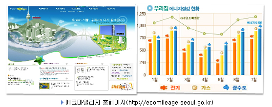 '에코 마일리지제' 도입! 가정은 스마트 전기계량기 등 제공, 단체는 녹화조성비 지원 서울시는 에너지를 절약해 온실가스 감축에 기여한 개인이나 기관ㆍ단체에게 혜택을 주는 '에코 마일리지(Eco-mileage)' 제도를 15일부터 시행한다. 이 제도는 에코마일리지에 가입한 가정이나 단체가 일정기간 전기ㆍ수도ㆍ도시가스 등 에너지 사용량을 줄이면 그 실적을 온실가스(CO2) 감축량으로 환산해 이산화탄소 10g당 1마일리지를 주는 것이다. 마일리지가 쌓이면 저탄소 활동에 재투자할 수 있는 친환경 인센티브를 받는다. * 온실가스 감축량 산정법