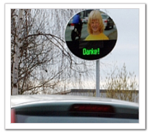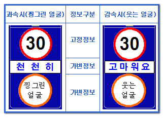 보행자에게는 심리적 안정감 주고, 운전자에게는 주의력 높이는 과속경보시스템 한 시민의 창의적인 제안이 서울시 사업으로 채택되어 곧 실행에 들어간다. 운전자의 감속을 유도하여 교통사고를 방지하는 과속경보표지판(Dialog-Displays)이 어린이 보호구역에 시범 설치되는 것. 새로이 도입하는 과속경보시스템인 과속경보표지판(Dialog-Displays)은 현재 국내에 설치되어 있는 과속경보시스템(Driver Feedback Sign)처럼 최고속도제한 지역에서 현재 속도를 표출하는 방식이 아니라, 제한속도 준수 여부에 따라 이미지와 문자를 달리 표출함으로써 운전자의 반응을 적극 유도하는 새로운 개념의 과속경보시스템이다. 이 시스템은 운전자가 과속으로 운전하다가 표지판을 보고 속도를 줄이면 표지판이 '천천히'에서 '고마워요'로 바뀌고, 사람의 이미지 또한 찡그린 얼굴에서 웃는 얼굴로 바뀌게 된다.