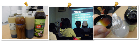 올해 들어 줄기차게 회자되는 화두가 있다면 저탄소 즉 녹색성장이 아닐까 싶다. 지구온난화에 따라 파괴돼 가는 지구환경을 살려보자는 것이다. 녹색성장 전략은 단순히 환경뿐 아니라 이제 경제, 문화, 사회 전 분야로 확산되고 있다. 하기는 기후변화에 지구의 모든 운명이 달려 있다고 해도 과언이 아니다. 하지만 녹색성장이 그렇게 거창한 게 아니라 일상에서도 얼마든지 추진 가능하다고 생각하는 사람들이 있다. 물과 에너지를 아끼고 자연과 환경보호를 생활화하려고 노력하는 주부들이 그들이다. 지난 주 금요일, 3ㆍ40대 주부들이 손에 뭔가 하나씩 들고 도봉환경교실을 찾았다. 얼핏 보면 우유병이다. 그런데 쌀뜨물이다. 오늘은 '쌀뜨물로 환경을 살리자'는 프로그램이 있는 날이다. 쌀뜨물이라면 예부터 된장국에 넣어 구수한 맛을 내거나 화초에 영양분을 주려고 사용했던 말 그대로 쌀을 한두 번 헹군 물이다. 하지만 그게 전부는 아니다. 쌀뜨물은 '트랜스포머'처럼 변신을 거듭하는 요술쟁이다. 쌀뜨물이 EM이라는 상대를 만나면서 예전과 다른 쌀뜨물 발효액으로 다시 탄생하는 것이다. EM은 'Effective Micro-organisms'의 머리글자를 딴 약자로 유용한 미생물군이란 뜻이다. EM원액에는 효모, 유산균, 누룩균, 광합성균 등 80여 종의 미생물이 들어 있다. EM은 항산화작용을 하면서 서로 공생하며 부패를 억제해 자연생태를 보전하는 효과를 한다고 알려져 있다. EM원액은 발효미생물제제로 친환경제품 가게에서 쉽게 구입할 수 있다. 쌀뜨물 발효액을 만들어 보는 시간. 방법은 간단하다. 먼저, 페트병에 쌀뜨물(1.4L: 페트병의 2/3 정도)을 담고 설탕(15g)과 EM원액(15ml)을 넣고 흔들어 뚜껑을 꼭 닫는다.(또는 당밀30g과 EM원액 30ml) 둘째, 직사광선을 피해 따뜻한 곳 실온에서 7일 정도 발효시킨다. 셋째, 일주일 후 페트병이 빵빵해지면 뚜껑을 천천히 열어 가스를 방출시킨다. 색깔은 커피색과 유사한 갈색을 띤다. 냄새는 시큼하고 막걸리 냄새와 유사하다. 이렇게 만들어진 쌀뜨물 발효액의 용도는 그야말로 약장수 얘기처럼 무궁무진하다. 음식 쓰레기에 발효액을 골고루 뿌려 4-5일 정도 발효시킨 찌꺼기를 원예용으로 쓰는 것은 벌써 알려진 고전이다.