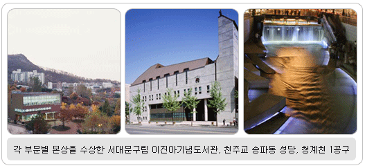 각 부문별 수상작품은 ▶ 신축 부문에 국립중앙박물관(대상), 서대문구립 이진아기념도서관(본상), 서대문청소년 수련관, 에코넷센터, 서울대학교대학원 교육연구동, 예화랑, 연세의료원 세브란스 새병원, 메리츠타워, 화원종합사회복지관, 청계천문화관, 영동교회(장려상) ▶ 리모델링 부문에 천주교 송파동 성당(본상), 서울상공회의소, 하루헌, 한남 힐사이드 외국인 임대아파트(장려상) ▶ 야간경관조명 부문에 청계천복원건설공사 1공구(본상), 서대문구청사, 잠실 로이타워, 독산 보도교(장려상) 등이다. 수상작 사진 및 패널 전시회는 12월 6~10일 코엑스 대서양홀에서 열리며, 전시기간 중인 7일 오후 3시에는 설계자, 건축주 등 총 38명의 수상자에게 상장, 기념동판 등을 수여하는 시상식을 개최한다. ■ 문의 : 주택국 건축과 ☎ 3707-8253, 도시디자인과 ☎ 3707-8756 |