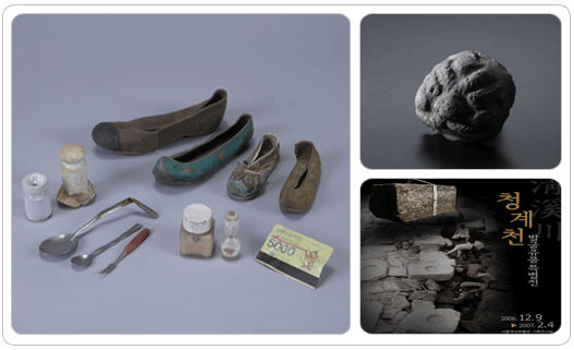 다리 유적 및 다양한 생활유물 전시 서울역사박물관은 서울발굴유물특별전 시리즈 세 번째인 ‘청계천발굴유물특별전’을 박물관 1층 기획전시실에서 개최한다. 2006년 12월 9일부터 2007년 2월 4일까지 열리는 이번 전시는 서울의 한가운데를 가로지르는 생활하천 청계천의 역사적 의미와 생생한 생활흔적을 고스란히 보여준다. ‘청계천발굴유물특별전’은 청계천 복원을 계기로 드러난 각종 유적과 다양한 생활유물을 통해서 청계천변 사람들의 생생한 생활상을 보여주고 동시에 문화재의 보호와 보존을 위한 시민들의 공감대를 형성하고자 하는 의도에서 기획했다. 청계천 복원공사를 계기로 드러난 호안석축을 비롯해서 청계천에 놓았던 각종 다리 유적 및 다양한 생활유물을 한데 모았다. 특히 그 동안 개최된 관련 전시에서는 볼 수 없었던 청계천의 실제 유물을 최초로 공개한다는 데 그 의미가 더욱 크다. 이번 전시는 호안석축과 광통교, 수표교, 하랑교, 효경교, 오간수문 등 청계천의 주요한 6개 유적을 개천이 흘러가는 방향에 맞춰 관람동선을 꾸민 것이 특징. 전시도입부에서는 청계천을 복개하기 전후의 사진과 발굴현장 사진, 경성부개설도 등 청계천과 관련된 문헌과 사진자료를 보여준다. 수표교에서는 다리의 하부구조와 조선시대 하천 수위계인 수표(水標)와 함께 청계천의 준천(濬川) 역사를 관련 유물을 통해 확인할 수 있다. 하랑교와 효경교에서는 청동거울과 석제탕기, 석제추를 포함한 각종 생활유물을 주로 보여주고 있다. 오간수문에서는 오간수문의 축소모형과 함께 철책문 및 거북형 석수(石獸)를 비롯해서 수문지(水門址)에서 나온 그릇편과 목제빗, 동전, 청동담뱃대 등 실생활에 사용한 다양한 일상품을 볼 수 있다.