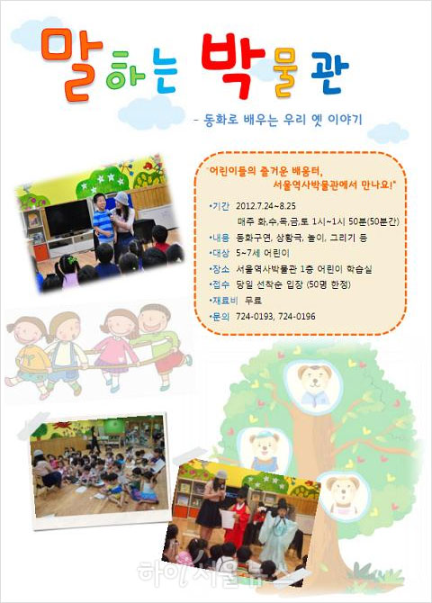 여름방학동안 서울역사박물관에서 열리는 이번 프로그램은 5~7세 어린이들을 대상으로 동화구연과 함께 영상, 놀이, 게임, 상황극 등 신나는 체험활동이 가득하며, 7월 24일(화)부터 8월 25일(토)까지 매주 화~토요일 오후 13:00~13:50에 1층 어린이학습실에서 꾸려진다.