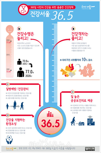 건강한 사람의 체온인 36.5℃처럼 따뜻하고 건강한 공공의료 정책을 추진해 시민 건강을 365일 꼼꼼히 챙기겠다는 의미를 담은 「건강서울 36.5」는 건강수명은 2020년까지 77세(05년 73.9세)로 늘리고, 건강격차는 현재 나타나고 있는 자치구간 사망률 격차를 2020년까지 10%P 줄여나간다는 목표로 추진된다.