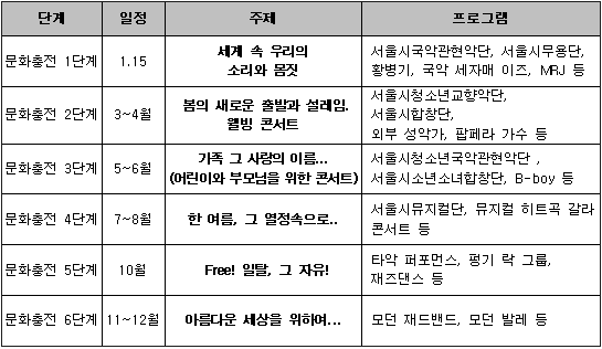 1월 첫 공연 1월5일(금)부터 예매 가능 천원으로 할 수 있는 일은 많지 않다. 고작해야 과자 한 봉지를 사거나, 버스 요금 내는 정도랄까. 영화를 보려고 해도 7,000원은 들여야 하고, 공연비만 해도 만원이 넘게 든다. 물질만능시대에 천원으로 행복을 찾는 건 쉽지 않다. 그러나 세종문화회관에서라면 얘기가 다르다. 세종문화회관에서는 많은 이들이 적은 비용으로 문화를 즐길 수 있도록 ‘천원의 행복’을 준비했다. 2007년에는 총 6개의 테마로 무대가 꾸며진다. 첫 공연인 1월15일(월)에는 ‘세계 속 우리의 소리와 몸짓’이라는 주제로 신명나는 시간이 펼쳐진다. 이후에도 관객들을 설레게 하는 '천원의 행복'은 계속된다. 3월과 4월에는 ‘봄의 새로운 출발과 설레임, 웰빙콘서트’가 진행되고, 5월과 6월에는 ‘가족 그 사랑의 이름... 어린이와 부모님을 위한 콘서트’, 7월과 8월 ‘한 여름, 그 열정 속으로...’, 10월 ‘Free! 일탈, 그 자유!’, 11월과 12월 ‘아름다운 세상을 위하여’가 마련돼 있다. '천원의 행복'은 세종문화회관 홈페이지 www.sejongpac.or.kr나 전화(02-399-1114~7)로 예약할 수 있으며, 1월 첫 공연 예매는 1월5일(금)부터 가능하다.