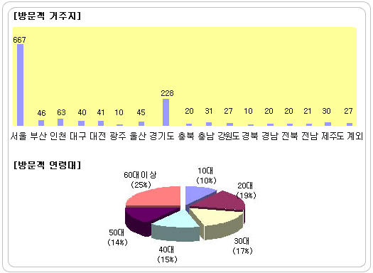 청계천 개장 457일만에 방문객 4천만명 돌파 청계천이 개장 1년3개월 만에 방문객 4천만 명을 돌파했다. 2005년 10월 개장한 청계천은 열흘만에 300만명, 58일만에 1천만명, 224일만에 2천만명, 338일만에 3천만명에 이어 457일만에 4천만명을 넘어서는 기록을 세웠다. 15개월간 월평균 267만2천명이 방문했으며, 주말 및 공휴일에 15만6천명, 평일에는 5만6천명이 청계천을 다녀간 것으로 나타났다. 서울시설공단은 청계천 4천만명 돌파를 기념해 설문조사를 했다. 지난 12월31일(일) 제야의 종 타종 및 야경을 즐기러 나온 방문객, 신년 3일간 청계천을 찾은 방문객을 대상으로 한 설문조사에서 “청계천을 다녀가신 적이 있으십니까?”라는 질문에 1천361명 중 71%인 963명이 “그렇다”고 대답해 청계천이 일회성 방문 대상이 아님을 확인했다. 거주지별로는 수도권이 69.6%(서울 49%, 경기 20.6%, 인천 4.6%), 지방은 28%(부산 5%, 대구 5%, 대전ㆍ울산 4% 등이며, 기타 지역 3%~1%)였으며, 외국인도 27명(캐나다2, 칠레2, 미국5, 인도2, 일본3, 중국7, 필리핀2, 대만4) 포함되었다. 이는 청계천이 서울시민 뿐 아니라 전 국민이 찾아오는 관광명소가 되었다는 것을 보여준다. 연령대는 10~30대 젊은층이 620명으로 46%를 차지하고, 40대~50대 중년층이 29%인 395명, 60대이상 노령층은 346명 25%로, 청계천은 모든 연령층이 고루 찾고 있는 것으로 나타났다.