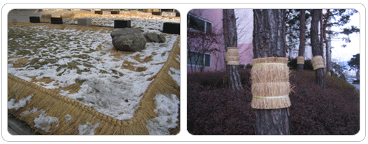 이 뿐 아니다. 짚풀로 짚신을 만들어 신고 여분의 짚신은 장에 팔아 썼으며 깨끗한 볏짚으로 만든 금줄 새끼줄은 아이를 낳았다는 주술적 표현을 의미했다. 볏짚은 사실 우리 농경문화의 유산이다. 볏짚문화로 대변되는 농경생활의 유구한 역사만큼이나 그 용도와 쓰임새는 참으로 다양했다. 그러나 볏짚은 60년대 근대화물결을 타고 갑작스레 자취를 감추고 말았다. 볏짚을 대용할 편리한 대체물이 나오면서 볏짚은 추억거리로만 남은 것이다. 하지만 아직도 간간이 볏짚을 이용한 지혜들을 살필 수 있어 옛 향수를 느끼게 한다. 나무볏짚을 마주하면서 요새 며칠간 볏짚을 활용한 겨울나기 모습을 카메라에 담았다. 장미의 구근을 보호하고 가냘픈 나무줄기를 보온하는데 쓰인 볏짚은 영락없이 털옷과 털모자같이 보인다. 따뜻한 볏짚과 함께 하는 겨울이라면 그리 춥지 않을 것이란 생각이 든다. | |
