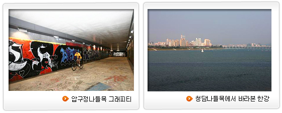 개성있는 쇼핑명소와 맛집들로 소문난 이곳에서는 윈도쇼핑만으로도 오감이 즐거워진다. 이곳에서 도보 11분, 자전거 3분(750m) 거리에 위치한 압구정 나들목을 들어서면, 탁 트인 한강이 눈에 들어온다.