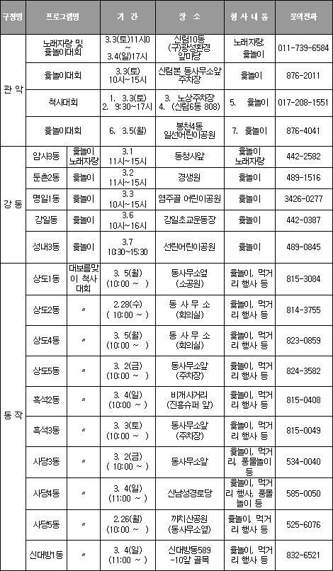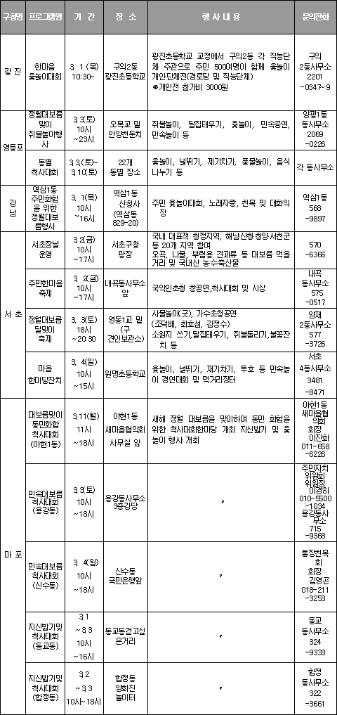 서울시 및 각 자치구, 정월대보름 이벤트 개최 정월대보름이 며칠 앞으로 다가왔다. 서울시 및 자치구에서는 대보름을 맞아 잊혀져 가는 세시풍속을 체험할 수 있는 행사들을 마련한다. 남산골 한옥마을, 운현궁 등은 서울 도심에서 전통놀이를 즐길 수 있는 대표적인장소이며, 이밖에도 한강시민공원, 각 자치구에서도 다양한 이벤트를 즐길 수 있다. 설이나 추석, 대보름 같은 명절에 많은 사람들이 몰리는 남산골 한옥마을은 3월4일, 오곡밥 제조 시연 및 시식 및 땅콩·호두·밤 등 부럼깨기, 한 해 동안 행운을 기원하기 위해 농악대의 지신밟기와 달집태우기, 소원문 쓰기 등이 마련되어 있다. 특히, 달집태우기는 월출시간에 맞춰 저녁 7~8시에 열리는데, 시민들이 쓴 소원문을 달집에 장식하고 고사를 지낸 후 달집을 태워 보내는 행사이다. 달집을 태울 때에는 달집 주위를 돌며 관람객이 함께 강강술래를 춘다. 이밖에도 묵은 나물로 만든 진채식, 달을 보며 먹는 음식인 원소병 등 정월대보름에 즐겨먹던 음식도 전시된다. 운현궁에서는 윷·널뛰기·투호·제기차기 등 민속놀이와 오곡밥, 부럼깨기 등을 할 수 있다. 또한 오후 1시부터는 가족대항 줄넘기와 팔씨름대회가 진행되고, 2시부터는 대동한마당도 펼쳐져 관람객들의 흥을 돋울 예정이다. 한강시민공원 선유도공원에서는 3월4일 ‘2007 선유도 대보름 국악한마당’이 개최된다. 2시30분, 대통령상을 수상한 광주고등학교 농악단길놀이가 문을 열고, 3시부터는 본마당이 시작된다. 무형문화재 이수자 한진자, 노경미, 노학순의 경기민요, 중요무형문화재 17호 가면극인 봉산탈춤, 국가지정 무형문화재 판소리 제5호 준보유자 정옥향 등의 남도민요 열창이 이어진다. 이어서 광주고등학교 농악단의 삼도사물놀이로 행사가 마무리된다. 보라매공원은 대보름 하루 전 날인 3월3일, 오후3시부터 액막이 연만들기, 널뛰기, 대형윷놀이, 굴렁쇠, 큰줄넘기, 쥐불놀이 등 정월대보름 풍습을 체험하는 놀이한마당이 펼쳐져 분위기를 고조시킨다. 낮에는 윷놀이판, 저녁에는 마을 동산에 올라 동천에 뜨는 달을 보며, "달 봤다"고 외치면서 한 해 소원을 빌고, 볏짚, 솔가지, 댓가지로 높이 쌓아 만든 달집에 불사르기로 달을 맞이한다. 이 곳을 방문하는 시민 누구나 참가할 수 있다.