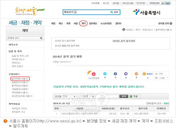 공개 정보는 서울시 홈페이지(http://www.seoul.go.kr)에서 분야별 정보 ► 세금‧재정‧계약 ► 계약 ► 조회서비스 ► 발주계획 순으로 들어가면 확인할 수 있다.