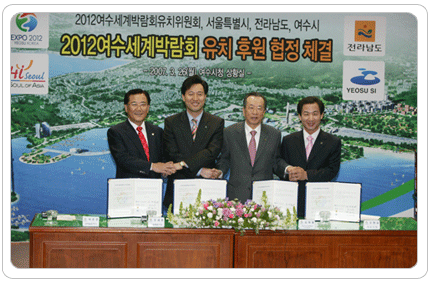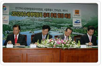 각종 홍보 및 유치활동 편의 제공 서울시가 2012년 여수세계박람회 유치를 위해 힘을 보탠다. 이날 오세훈 서울시장은 김재철 유치위원회 위원장(동원그룹 회장), 박준영 전남도지사, 오현섭 여수시장과 함께 후원협정을 체결하고 2012년 세계박람회 여수 유치를 위해 함께 협력하기로 합의했다. 이로써 서울시는 유치위원회, 전라남도, 여수시가 2012세계박람회 유치를 위해 제작하는 각종 홍보물과 광고에 서울시의 로고를 사용할 수 있도록 하고, 세계박람회 유치를 위한 홍보와 편의제공을 지원하게 된다. 또 유치위원회와 전라남도 및 여수시는 서울시가 2012년 세계박람회 유치 후원기관으로서 광고 등 홍보를 위해 유치위원회의 공식명칭을 사용할 수 있도록 하며, 유치활동에 대해 적극 지원하고 협조할 계획이다.