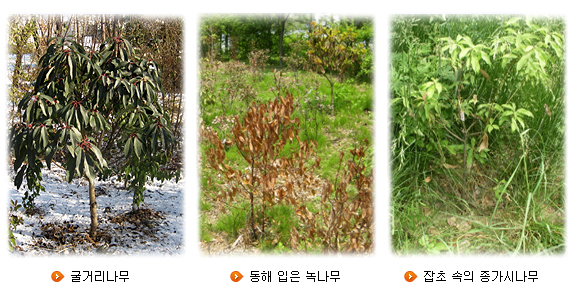 지난 여름철에 잡초의 등살에 종가시나무는 2~3주가 죽었지만 그래도 남은 종가시나무는 제법 자랐다. 서울에서도 남부지방 만큼은 아니더라도 좋은 환경에서는 종가시나무가 잘 자라는 것을 확인할 수 있었다. 그리고 굴거리나무는 서울에서도 꿋꿋하게 잘 살고 있다. 내장산이 자생지 북방한계선인 굴거리나무는 작년 겨울 추위에 잎 등이 동해를 입었지만 그래도 20여 주 모두가 겨울을 잘 지냈고, 여름철에도 잡초와의 경쟁에서도 모두 잘 견디었다.