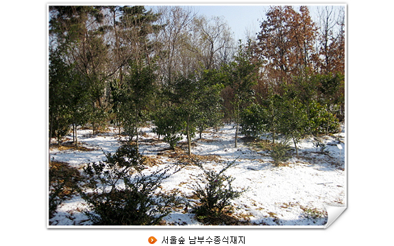서울숲에서는 3년 전부터 남쪽지방의 난대수종 7종(種)의 어린 묘목들을 시험 삼아 기르고 있다. 서울의 기후변화를 모니터링 하기 위하여 꽝꽝나무, 동백나무, 먼나무, 다정큼나무, 굴거리나무, 종가시나무, 녹나무 등 7종의 어린 나무들을 시험재배하고 있다.