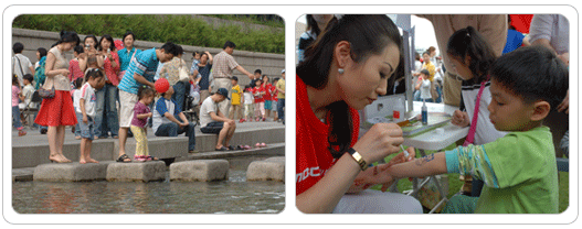 청계광장 어린이날 행사 5월 5일 청계광장은 그야말로 어린이들의 천국이다. 유명인들의 공연, 체험행사, 놀이마당까지 어린이들이 꿈꾸는 세상이 펼쳐진다. 아이들이 좋아하는 기린모양의 에어바운스와 페이스페인팅, 풍선 아트 등 눈이 휘둥그레질 행사들도 가득하다. 제기차기, 투호던지기, 널뛰기 등 가족들이 함께 즐길 수 있는 민속놀이 한마당도 열린다. 청계광장 우측도로에서는 간단한 실험도구를 제작하고 체험할 수 있는 과학체험놀이교실이 마련된다. 중력, 추진력 등의 원리를 설명해 줄 ‘떳다떳다 비행기’와 오목거울을 통해 빛의 반사 성질을 알아보는 ‘신기루’ 등의 프로그램이 운영된다. 축하공연에는 ‘태권무술시범’, ‘서울시립어린이합창단’, ‘비보이 축하공연’, ‘퓨전국악’, ‘캐릭터 쇼’ 등이 예정돼 있다. 또 2006년 전국청소년문화큰잔치에서 대통령상을 받은 서울 성내초등학교의 풍물놀이 공연도 펼쳐져 흥겨운 시간을 갖는다. 한편 서울시청 태평홀에서는 11시부터 한 시간가량 어린이날 기념식과 함께 모범 어린이 및 소년상 시상식이 진행된다. 오세훈 시장을 비롯하여 수상자와 수상자 가족 등 150여 명이 참석할 예정이다.