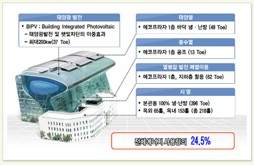 이렇듯 에너지효율 1등급으로 설계된 신청사는 전체 에너지 소요량의 약 24.5%를 친환경·신재생 에너지로 활용하게 된다. 태양광발전으로 최대 37Toe의 전기 에너지를 생산하고, 태양열·중수열·열병합발전 폐열을 이용해 124Toe를, 지열로 약 396Toe의 에너지를 생산하는 것이다.