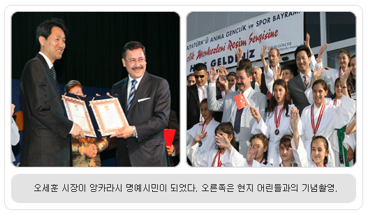 ‘서울의 날’ 기념전 개막 … 앙카라 시민증 수여받은 오세훈 서울시장 같은 날 오세훈 시장을 비롯한 공식 대표단은 한국전에서 전사한 765명의 무명 용사들의 영혼을 안치한 한국공원을 방문, 한국참전 터키탑 앞에서 참전용사를 기리며 헌화했다. 이어 멜리 괵책(Melih Gokck) 앙카라시장 내외와 서울시 방문단 및 주터키대사와 함께 쟈펠 전시관에서 개최되는 ‘서울의 날’ 기념전시회 개막식에 참석했다. 이 자리에서 오시장은 축사를 통해 “서울은 전통과 현대가 조화를 이루고 있는 아름다운 도시”라며 서울을 소개하고 “오늘의 행사는 서울이 어떤 곳인가를 알림과 동시에 앙카라시와 서울시가 앞으로 지속적 교류와 협력을 확대해 나가기 위해 마련됐다”고 밝혔다. 한편 멜리 괵책 앙카라시장은 오세훈 시장에게 앙카라시 명예시민증을 수여함으로써 양 도시간 우정을 돈독히 했다. 시민증을 수여받은 오세훈 시장은 “유럽과 아시아를 잇는 동서 문명의 가교인 터키의 수도, 앙카라시의 명예시민으로서 그 뜻을 소중히 간직하겠다”고 감사의 뜻을 표했다. ‘서울의 날’ 행사 중에는 ‘서울시 전자정부 체험관’을 설치ㆍ운영하여 앙카라 시민 및 관계자를 대상으로 서울시 전자정부를 소개하고, 인터넷을 통해 직접 체험할 수 있는 기회를 제공한다. 또 ‘서울시 교통시스템 체험관’에서는 서울교통관리시스템(TOPIS), 버스카드 및 지하철카드(T-money)를 선보이고, 홍보사진전, 관광마케팅전, KBS 한국드라마 홍보전이 열린다. 다채로운 홍보활동이 펼쳐지는 ‘서울의 날’ 기념전시회는 21일까지 열린다. |