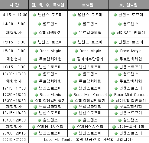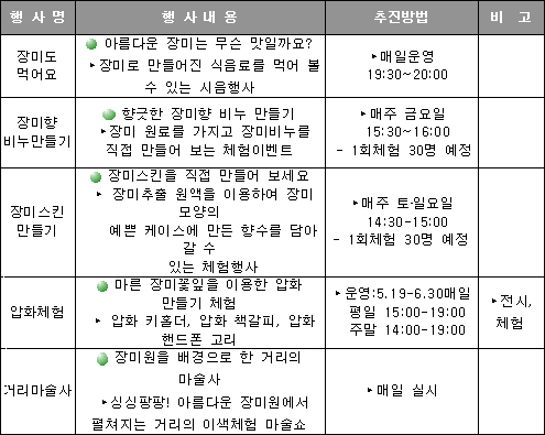 26일 오후 1시 개막식을 비롯 축제기간 중 오후 10시까지 개장 25일부터 3백여종 수천만 송이 장미가 화려한 자태를 뽐내는 국내 최대의 장미 축제가 서울대공원에서 펼쳐진다. 서울대공원은 25일부터 내달 30일까지 서울대공원내 2만여평의 장미원에서 장미축제를 개최한다고 23일 밝혔다. 오후 10시까지 야간개장을 하는 이번 축제에는 프랑스, 스페인, 미국 등 17개국의 댄스가 펼쳐지는 ‘환상의 댄스파티’공연이 매일 3회 실시되는가 하면 통기타 가수의 라이브 공연과 사랑의 세레나데를 감상할 수 있는 ‘Love Me Tender' 가 매일 오후 8시 15분부터 진행되는 등 다양한 공연이 마련된다. 또 장미원 옆 어린이동물원에서는 사슴, 양, 염소 등 아기 동물들을 직접 안아보고 함께 사진 촬영도 할 수 있는 상설전시장 운영을 비롯 테마정원에서는 허브 향기 가득한 ‘오색 오감 꽃 페스티벌’이 펼쳐진다. 장미를 원료로 한 식음료 시음행사를 비롯 장미 향 비누 만들기, 장미 스킨 만들기, 압화 체험 등 시민들이 참여할 수 있는 체험 이벤트도 다양하게 마련된다. 특히 293종 3만2천주의 장미, 기린, 달팽이 등 동물 모형의 루미나리에 14점, 폐품을 활용한 50점의 정크 아트 및 오감을 느낄 수 있는 4만본의 꽃 등을 전시, 축제에 참가한 시민들에게 다양한 볼거리를 제공하는 한편 7월 31일까지 장미원을 배경으로 한 사진 공모전을 실시한다. 응모자는 서울대공원 홈페이지(http://grandpark.seoul.go.kr)로 접수하면 된다. 축제와 관련 서울대공원관리사업소 관계자는 “수 천만 송이 장미가 아름다운 자태를 드러낸 가운데 펼쳐지는 이번 축제에는 화려한 조명불빛과 조명 분수도 또 다른 볼거리로 제공된다” 며 “특히 계곡을 연상할 수 있는 실개천을 조성하여 시민들이 시원하고 환상적인 장미원 축제에서 아름다운 추억을 많이 만들기 바란다”고 밝혔다.
