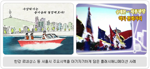 수상자에게 주어지는 혜택 풍성해요~ 이번 공모전은 수상자에게 상금과 함께 다양한 혜택을 제공해 눈길을 끈다. 이외에도 수상자 전원이 서울시 멀티미디어 사이트 WOW서울(wow.seoul.go.kr)의 명예의 시민작가로 위촉돼, 서울시 시민작가로 활동할 수 있게 된다. 또한 디자인정글과 다음에서는 수상작 온라인시사회와 갤러리를 지원하며, 해외 UCC 사이트 등에 수상작을 홍보하고 청계천 광교와 서울애니메이션 센터 등에서 오프라인 시사회가 있을 예정이어서, 관련 분야에서 자신의 자질을 알리는 데 유용할 것으로 보인다. 자세한 사항은 다음(www.daum.net)에서 서울사랑 공모전을 검색하거나 다음카페(cafe.daum.net/hiseoulucc)에 들어가면 볼 수 있다. 이 행사는 (주)다음커뮤니케이션, (주)디자인정글, (사)한국애니메이션제작자협회, (사)한국애니메이션예술인협회, (사)한국만화애니메이션학회에서 후원한다. 한편, UCC 중 하나인 플래시애니메이션은 인터넷 동영상제작 소프트웨어인 플래시(Flash)를 이용해 만든 컴퓨터 애니메이션으로, 제작방법이 간단해 전문가뿐 아니라 일반인도 손쉽게 제작할 수 있다. ■ 문의 : 서울시 홍보담당관실 ☎ 3707-9835, 9847 |