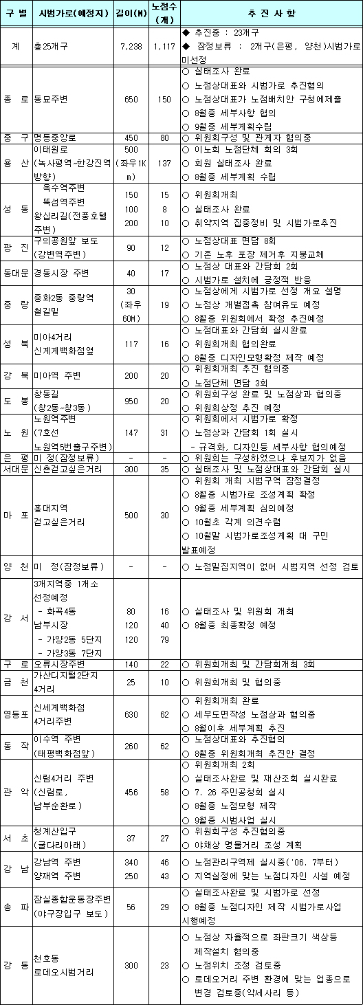 시범가로 평가 후 2008년부터 타지역으로 확대 자치구별 노점 시범가로에는 총 1,100여개 노점이 운영될 예정이다. 이는 전체 노점의 10% 정도로, 현재 서울시내 노점은 1만2,000여개에 이른다. 시범가로 노점상은 점용료를 내고 일정기간동안 합법적으로 노점을 운영할 수 있으며, 노점상들은 이미 해당 지역에서 영업하던 노점상 중 기초생활수급자 등을 위주로 선정한다. 또 시범가로에는 시간제가 적용돼 오후 4시 무렵부터 자정까지만 영업이 허용된다. 그러나 자치구청장의 권한으로 탄력적인 시간 조정도 가능할 방침이다. 올 10월부터 시행될 노점 시범가로 예정지는 ▲종로구 동묘공원 ▲중구 명동 ▲용산구 이태원 ▲성동구 뚝섬역 앞 ▲광진구 구의공원 ▲동대문구 경동시장 ▲중랑구 중랑역 ▲성북구 미아사거리 ▲강북구 미아역 ▲도봉구 창동길 ▲노원구 노원역 ▲서대문구 신촌 지역 ▲마포구 홍대▲강서구 가양동 지역 ▲구로구 오류시장 ▲금천구 가산디지털사거리 ▲영등포구 신세계백화점 사거리 ▲동작구 이수역 ▲관악구 신림사거리 ▲강남구 강남역 ▲송파구 잠실종합운동장 ▲강동구 로데오거리 등이다. 그러나 은평구와 양천구의 경우에는 노점밀집지역 등이 없어 시범가로 선정이 잠정 보류된 상태다. 시는 시범가로 운영 후 시민여론 및 평가결과에 따라 2008년부터 노점 시간제·규격화 사업을 타지역으로 확대한다는 계획이다. 또한 2009년부터는 노점을 체계적으로 관리할 수 있는 노점관리조례제정을 추진키로 했다. 문의 ☎ 02-3707-9637 (건설기획국 건설행정과)