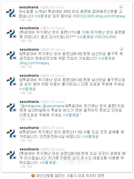 서울시는 앞으로도 제설과 관련된 알기 쉬운 정보를 SNS로 시민들에게 알릴 예정이며 해쉬 태그 ‘#서울제설’을 통한 제보방법을 지속적으로 홍보할 예정이다. 최근 일본 대지진 때에도 보았듯이 SNS가 재난현장에서 큰 역할을 하고 있다. SNS의 실시간 정보 전파 능력은 그 어떤 것보다 효과가 뛰어나기 때문이다. 올 겨울, SNS를 통하여 재난 상황을 예방하고 신속하게 대처해 모든 시민이 안전하게 겨울을 보낼 수 있기를 기대해 본다. 서울시 대표 SNS는 트위터(@seoulmania), 페이스북(@seoul.kr), 미투데이(@haechiseoul) 등이다.