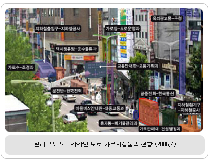 내년까지 10곳, 2010년까지 25개 거리 조성 ‘디자인서울 거리’ 조성은 관리부서가 제각각인 도로 가로시설물의 현황을 파악하여 이를 한 곳에서 관리·디자인 하는 사업으로, 현재 옥외광고물은 구청, 가로수는 조경과, 분전반은 한국전력, 교통안내판은 교통기획과에서 관리하고 있는 실정이다. 그러다 보니 ‘걷고싶은 거리’, ‘간판이 아름다운 거리’ 등 다양한 가로환경개선 사업들이 추진되고 있으나 시행주체도 다르고, 통일성을 갖기 어려운 상태다. 이에 따라 시는 디자인서울총괄본부를 중심으로 거리 시설물을 통일하는 사업을 시행해나가기로 했다. 우선 올해 9월 12일까지 자치구에서 제출한 500m 내외의 대상지를 접수하여, 서울시의 심의를 거쳐 10개소를 선정한다. 이후 10월부터 2008년 3월까지는 설계를 실시하고, 4월 착공한 이후 11월에 사업을 완료할 예정이다. 사업이 진행되면 대상지역의 보도블록, 통합지주, 가판대, 버스정류장, 벤치, 휴지통 등 가로시설물이 새로운 디자인 가이드라인에 의해 조정되고 통합적으로 설계된다. 예산은 1곳당 43억원 정도가 소요될 것으로 보이며, 간판정비를 위해 대상거리 내의 합법간판에는 간판디자인 비용(50만원 이내)과 간판설치 후 외관마감 비용(100만원 이내)이 지원될 계획이다. 시는 올해 대상지 10곳, 내년 10곳, 2009년 5곳 등을 선정해 민선4기 내에 총 25곳의 '디자인서울거리'를 조성한다는 방침이다.
