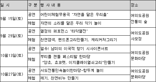 온 가족이 즐기는 문화프로그램 … 2007공원예술체험마당 시간상, 거리상의 이유로 캠프를 떠나는 것이 부담된다면, 문화공연을 접하는 것은 어떨까.가을을 맞아 여의도공원에서는 가족들을 위한 2007공원예술체험마당이 펼쳐진다. 2007공원예술체험마당은 그간 서울시녹지사업소가 운영해 온 우리문화순회체험마당, 창작체험마당 등 다양한 프로그램을 어울려 탄생시킨 것으로 6월 9일부터 8월25일까지 양재시민의 숲과 보라매공원에서 운영돼 시민들에게 높은 호응을 얻었다. 하반기에는 시간대를 토요일 2시로 옮겨 진행한다. 날짜는 9월8일부터 10월 27일까지로 주말 오후 가족들이 즐길 수 있는 다양한 문화 프로그램이 운영된다. 다가오는 15일에는 어린이체험무용극 ‘자연을 닮은 우리춤’이 공연되고, 29일에는 열정의 퍼포먼스 ‘타악열전’이, 10월 13일에는 남미의 분위기를 느낄 수 있는 무대가 마련된다. 마지막 무대인 27일에는 서도전통민속놀이한마당이 펼쳐져 우리 가락을 신명나게 즐길 수 있는 시간을 갖는다. 이 밖에 천연염색, 핸드폰고리만들기, 캐리커쳐그리기 등 다양한 체험 프로그램도 진행된다. 기타 자세한 행사내용은 정동예술단(02-752-1946), 서울시녹지사업소(02-843-4616)에 문의하거나 서울의공원 홈페이지(parks.seoul.go.kr)를 참조하면 된다. 참가비는 무료.