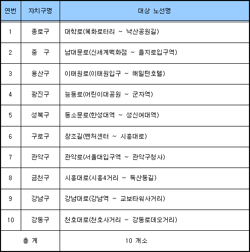 대학로, 남대문로 등 디자인서울 거리 10곳 선정 종로구 대학로(혜화동 로터리~낙산공원길)에는 공연 인프라를 조성, 낙산과 연계해 문화와 자연이 숨쉬는 공연 생태거리로 조성하며, 중구 남대문로(신세계백화점~을지로입구역)는 경관조명과 바닥패턴 교체, Cross 횡단보도, 쌈지공원 조성, 통합시설물 디자인과 버스정류장 개선 등을 통해 정온한 비즈니스 거리로 거듭난다. 용산구 이태원 거리(이태원 입구~해밀턴관광호텔)는 관광특구의 특성을 살려 한국문화의 정체성과 이국적인 분위기가 조화된 거리를 조성하고, 광진구 능동로(어린이대공원 정문~군자역)는 아차산 고구려 축제와 연계되는 야간경관을 연출하고, 세종대학교 담장허물기, 에코 디자인 개념을 적용한 가로수 수종 갱신 등을 통해 어린이 특화거리로 만들어진다. 성북구 동소문로(한성대역~성신여대역)는 젊음의 거리, 서울성곽과 성북천 복원 등으로 비워진 도시에 역사ㆍ자연ㆍ기술이 만나는 거리를 만들고, 구로구 창조길(벤처센터~시흥대로)은 디지털과 자연의 접목을 통한 역사적 거리를 조성한다. 관악구 관악로(서울대 입구역~관악구 신청사 구간)는 보도와 주변 환경의 통합개선전략을 통해 녹지 거리를 만들고, 금천구 시흥대로(시흥4거리~독산동길)는 건물과 사람이 하나 되는 시범가로 조성사업과 가로 정원화 사업을 벌인다. 강남구 강남대로(강남역~교보타워사거리)는 IT 및 첨단기술을 이용해 기능적이면서 감성적인 거리를 연출하고 야간 조명계획을 통해 잠들지 않는 푸르른 거리를 만들며, 강동구 천호대로(천호사거리~강동 로데오거리)는 보행자 중심의 가로시설 도입, 국제수준의 명품도시 가로로 조성될 계획이다. ■ 문의 3707-8594 (서울시 디자인서울총괄본부 도시경관담당관) | ||