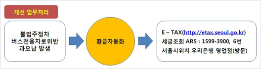 교통위반 과태료 과오납 환급을 받으려면 서울시 지방세 인터넷 납부시스템 E-TAX(etax.seoul.go.kr)에서 공인인증서로 로그인을 하고 과오납금 조회 후에 본인 계좌로 이체하거나, 신분증을 지참하고 서울 시내 모든 우리은행 영업점을 방문해 처리하면 된다. 또 ARS (1599-3900, 지방세환급금 : 6번)에서도 환급 신청이 가능하다.