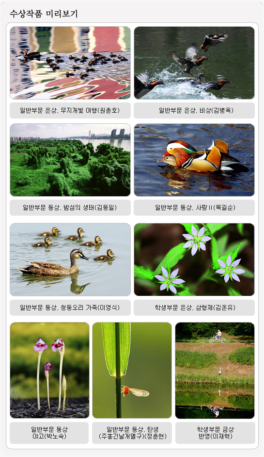 우수작 57점 선정…15(월) 시청 태평홀에서 시상식 ‘서울 야생 동・식물 사진공모전’의 수상자가 결정됐다. 금상 일반부문에는 아시아실잠자리의 짝짓기 모습을 포착한 허현 씨의 작품 ‘짝’이, 학생부문에는 왜가리를 바라보는 어린아이의 모습을 재미있게 담아낸 이재혁 씨의 ‘반영’이 선정됐다. ‘서울 야생 동・식물 사진공모전’은 자연생태의 아름다움을 느끼고 환경보전의 필요성을 일깨우기 위해 마련된 행사로 올해로 1회째를 맞는다. 공모기간 동안 접수된 작품은 총 664점으로 시는 그 중 인간과 공존하는 야생 동・식물의 모습을 잘 나타낸 57점의 작품을 우수작으로 선정했다. 15일 11시 태평홀에서는 수상자에 대한 시상식이 진행됐다. 시상식에는 김흥권 부시장이 참석해 우수작품 수상자에게 상장을 전달했다. 시상식과 함께 같은 날 서울광장에서는 ‘서울 야생 동・식물 사진공모전 수상작품’이 전시됐다. 수상작을 살펴보면, 일반부문 은상에는 원앙의 아름다운 비상모습을 담은 ‘비상(김병옥)’과 안양천 오리가족의 모습을 재미있게 포착한 ‘무지개빛 여행(원춘호)’이 뽑혔고, 동상에는 ‘밤섬의 생태(김동일)’, ‘야고(박노숙)’, ‘사랑Ⅱ(목길순)’, ‘청둥오리가족(이영식)’, ‘탄생(정춘현)’이 선정됐다. 이와 함께 학생부문에는 사이좋은 형제처럼 피어있는 꽃을 포착한 ‘삼형제(김온유)’가 은상으로 선정됐고, 남방부전나비의 아름다움을 포착한 ‘벌개미취와 남방부전나비(정다은)’ 등 7점의 작품이 입선으로 선정됐다.