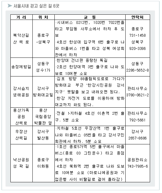 서울시내 산책길, 숨겨진 명소 ‘단풍과 낙엽의 거리’ 이외에도 서울에는 걷고 싶은 충동을 일으키는 매력적인 길들이 많다. 성동구 한양대 앞 중랑천 뚝길(송정제방길)의 경우, 수양버들, 은행나무, 소나무 등 갖가지 나무를 관찰할 수 있는 유익한 장소다. 이 산책로엔 특히, 한줄로 뻗어 있는 은행나무길이 있어 제격이다. 느릿느릿 산책을 하며 자녀들과 그간 하지 못했던 얘기 들을 나눠도 좋을 듯. 산책로에는 벤치가 있어 편안하게 간식을 들 수도 있다. 왕복 약 2km, 1시간 소요. 방화대교 밑 강서 습지 생태공원도 숨겨진 명소 중 하나다. 한강과 접해 있는 이 곳은 전형적인 강변의 습지 모양을 하고 있다. 공원내 곳곳에는 요새 한창 물이 오른 물억새가 사람 키보다 크게 자라 장관이다. 담수지를 끼고 조성된 목재 보행 데크와 자연관찰로를 걸으며 길 주변에 자라는 물억새, 붉은 여뀌, 층층이꽃, 으아리, 개망초 등 요즘 한창인 들꽃들을 만날 수 있다. 북악산길 산책로는 그야말로 사색하기 좋은 길로 유명하다. 종로구 창의문에서부터 시작하여 북악 스카이웨이길을 끼고 멀리 성북구 여성회관까지 조성된 이 길은 무려 6km나 되지만, 경사가 완만하여 부담이 없다. 산책로를 걷다보면 팔각정을 만나는데 이 곳 전망은 그야말로 최고. 흡사 지리산 성삼재에 온 듯한 착각이 일 정도로 주변 풍경과 산세가 정말로 근사하다. 중간 중간에 벤치가 있으므로 간식이나 요기, 휴식이 가능하다. 단, 22:00부터 다음 날 04:00까지는 산책로가 통제되므로 유의하자. 또 가족과 함께 하고 싶다면, 용산 가족공원을 이용해보자. 초지의 외곽을 도는 산책로를 지나면 숲 속 길이 나오는데, 숲에는 단풍나무와 꽃사과, 느티나무 등이 고루고루 자라고 있어 산책할 맛이 저절로 난다. 산책로 길이는 약 1.5km. 용산 국립 박물관이 바로 인접해 있어, 박물관 바깥에 있는 문화재 등을 구경할 수도 있다.
