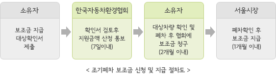 ※ 보조금 지급 절차 : 보조금 지급대상 확인 신청 ⇨ 보조금 지급 확인 ⇨ 폐차 ⇨ 보조금 지급신청 ⇨ 보조금 지급