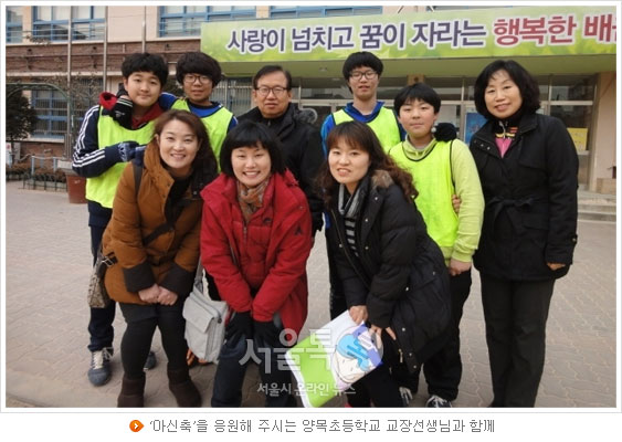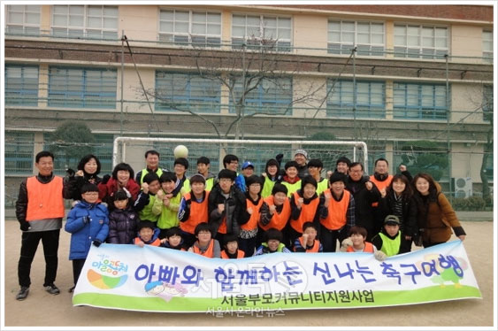 [서울톡톡] 지난 1월 11일 오후 3시에 찾아간 양천구 서울 양목초등학교 운동장, 영하의 날씨에도 외투는 벗어둔 채 연습 경기에 몰입해 있는 아이들이 공을 쫓기에 여념이 없었다. 5, 6학년생과 아빠들이 뭉친 연두색 조끼의 연합팀과 주황조끼의 중학생 단일팀이 벌이는 이 축구경기는 '아빠와 함께하는 신나는 축구여행(이하 아신축)'팀의 축구경기로 올해로 2년째 진행되고 있다.