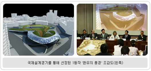 녹지와 건축물의 조화가 뛰어난 ‘환유의 풍경’ 국제설계경기 통해 선정 서울시는 지난 4~8월 국내 건축ㆍ도시ㆍ조경 전문가들로 구성된 선정위원회의 추천을 통해 국내ㆍ외 저명 건축가 8명(국내ㆍ외 각 4명)을 선정하여 지명초청 방식으로 현상설계경기를 진행하였다. 작품심사 결과 1등에는 영국 건축가 자하 하디드 Zaha Hadid 작품이 당선되었고, 심사 종반까지 1등과 경합을 벌인 2등에는 한국 건축가 조성룡 작품, 3등에는 미국 건축가 스티븐 홀 Steven Holl의 작품이 결정되었다. 1등 당선 작가인 자하 하디드는 1951년 이라크 바그다드에서 출생한 세계적 건축가로서 여성으로서는 최초로 2004년 건축계의 노벨상 격인 프리츠커(Pritzker)상을 수상하였다. 작품의 제목은 ‘환유의 풍경(Motonymic Landscape)’으로, 동대문 공원화 사업이 지닌 역사적, 문화적, 도시적, 사회적, 경제적 요소들을 통합해 하나의 풍경을 만들고자 했다. 심사위원장인 조나단 바넷은 “자하 하디드의 작품은 녹지와 건축물의 조화가 뛰어나고, 디자인센터에 적합한 디자인이며, 어느 지점에서 봐도 일관적 이미지를 연출하고 있다.”고 평했다. 동대문운동장 공원화사업의 기본방향은 공원조성, 월드디자인플라자 건립, 역사보존, 지하공간 활용, 교통환경 개선 등이었는데, 자하 하디드의 작품은 공원과 건물을 분리하지 않고, 조경과 건축을 융합했다는 것이 특징이다. 또한 동대문운동장 주변의 건축물이 고층인 점을 감안해 운동장의 공원적 성격과 기능을 살리기 위해 저층(2층)으로 계획하고, 상부까지 공원을 확장함으로써 부지 전체가 공원으로 활용되도록 해 “건물이 공원에 포함된 듯 조경과 건물이 일체가 되고, 건물 내부에서도 액체의 흐름이 모티브로 느껴진다.”는 심사위원회의 평가를 받았다.