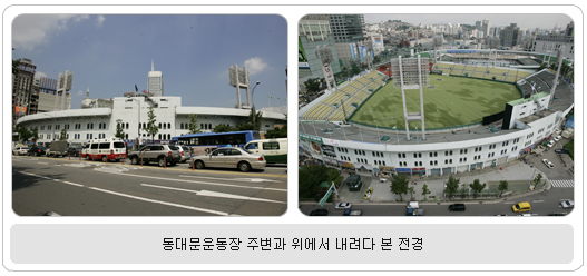 동대문운동장 공원화사업의 배경 및 추진경과 동대문운동장은 1925년 일제에 의해 설치된 근대 공설운동장(당시 명칭 : 경성운동장)으로서 해방 후 각종 스포츠ㆍ행사의 집회 장소로 활용되어 왔으며, 1984년 잠실운동장이 건립되면서 우리나라의 대표적 종합운동장으로서의 지위를 넘겨주게 되었다. 현재 축구경기장은 그 기능이 폐쇄(2003.3.)되어 풍물시장과 임시주차장으로 사용 중이고, 야구장은 시설이 노후하여 지난 28일 전국대학야구대회 결승전을 마지막 경기로 문을 닫았고, 운동장 후면부는 쓰레기 청소차고지로 사용되고 있다. 반면, 동대문 상권은 점포수가 약 3만개가 넘는 과밀한 상가를 형성하고 1일 60만이 넘는 유동인구와 연간 210만명의 외국 쇼핑ㆍ관광객이 찾는 우리나라와 아시아를 아우르는 디자인ㆍ패션의 중심지이자 쇼핑타운으로 성장하였다. 그러나 동대문 상권의 심장부이며 구도심의 중심인 동대문운동장 주변은 노점이 밀집해 있고 버스ㆍ택시 등 주정차 혼잡이 극심한 무질서한 모습을 보이고 있어 아시아권, 더 나아가 세계적 수준의 시장으로 성장하는데 한계가 있는 상황이다. 이를 위해 서울시는 그간 시정개발연구원의 기능대체 연구 및 도시설계학회의 기본계획 연구와 시민 아이디어 공모, 각계각층으로 구성된 시민위원회 및 전문가 자문 등을 거쳐 국제현상설계 공모를 통해 지난 8월 최종적으로 설계자를 선정했다.