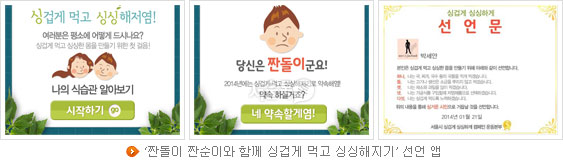 서울시는 페이스북 오픈 외에도 '짠돌이 짠순이와 함께 싱겁게 먹고 싱싱해지기' 선언 앱(http://goo.gl/PjiCcp)을 마련했다. 스마트폰으로 편리하게 나만의 식습관을 테스트해보고 진단을 받은 후 저염 실천을 약속하면 자신의 얼굴과 이름이 들어간 선언문을 받아볼 수 있다.