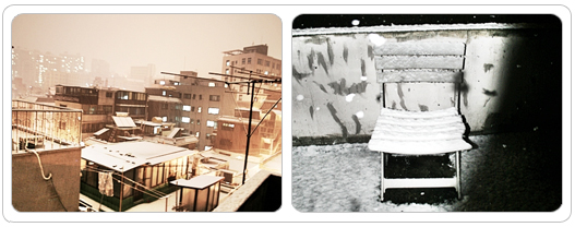 2007년 11월19일, 서울의 어둠이 깊어가는 밤 10시 경. 어머니가 잠시 외출하시다가 “눈이 오네” 라고 하시는 소리가 들렸다. 오늘 아침 기온이 영하 5도로 내려가 겨울옷을 꺼내 입었고, 본격적인 겨울이 시작됐다. 장롱 위 겨울옷이 담긴 종이 박스를 꺼내 여름과 가을 옷을 정리하고, 겨울옷을 꺼내 놓았다. 거리에도 두꺼운 겨울옷을 입은 사람들의 모습이 보였다. 그리고 저녁, TV에서 내일 새벽녘 비가 오다 기온이 내려가 눈으로 바뀔 것이라는 예보를 보았다. 예보를 본 후 창 밖에 눈이 쌓이는 풍경을 보고, 올해 일기예보는 적중했다는 생각이 들었다. 춥지만 잠시 창문을 활짝 열고 눈을 바라보고 만져보았다. 그리고 카메라를 꺼내 한 장의 사진으로 남겼다. 추억의 사진 한 장만큼 세월이 지난 후 남는 건 없기 때문이다. 가까운 집 마당부터 먼 동네의 풍경까지 새 하얀 눈이 세상을 덮고 있었다. 마음까지 깨끗해지는 순간이었다.