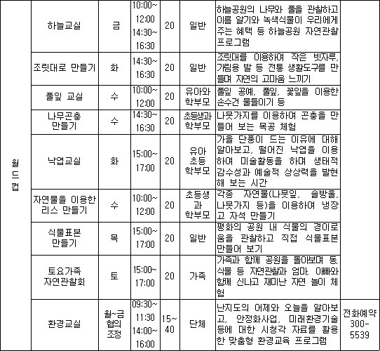 12월 공원이용 프로그램 26일부터 예약접수 공원에서 찾아낸 솔방울, 나뭇잎, 나뭇가지 등 다양한 자연물을 활용해 크리스마스카드, 리스, 트리 등을 직접 만들어 연말연시를 특별하게 꾸며보자. 서울숲에서는 초등학교 저학년을 대상으로 크리스마스카드, 리스, 트리 등 만들 수 있는 ‘조물조물 숲속 공작교실’을 매주 수요일 오후 4시에 운영하여, 자연 속에서 찾아낸 생각을 창의적이고 예술적인 감각으로 다양하게 표현해보는 체험기회를 가질 수 있다. 또한, 가족, 연인, 친구에게 사랑을 전하는 나만의 특별한 크리스마스카드를 만들어보는 ‘서울숲 북아트’는 일반인을 대상으로 4일(화), 11일(화), 오전 10시에 열린다. 길동생태공원(길동생태문화센터)에서는 낙엽 등 자연물을 이용한 나만의 크리스마스카드 만들기 프로그램인 ‘행운을 주는 크리스마스카드 만들기’가 가족들을 대상으로 매주 금요일 오후 3시 30분부터 진행된다.