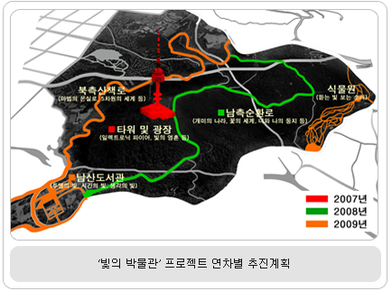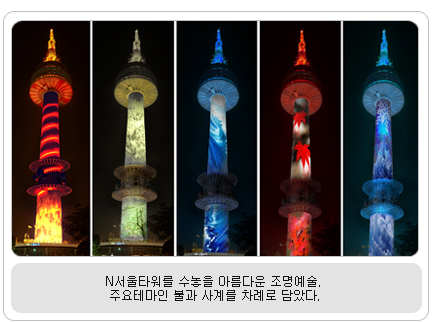 자연과 어우러진 은은한 빛의 예술 선보여 남산이 첨단 디지털 예술과 접목되어 빛을 주제로 하는 특색있는 예술 공간으로 재창조된다. 서울시는 남산을 서울의 대표적 야간관광명소로 조성하여, 자연과 문화·예술·엔터테인먼트가 결합된 감동적인 관광 콘텐츠로 우뚝 세우기 위해 남산 ‘빛의 박물관’ 프로젝트를 추진한다. 2007년 8월부터 2009년까지 약 3년여에 걸쳐 진행되는 남산 ‘빛의 박물관’ 프로젝트는 국내외 디지털 예술조명 작가의 작품을 남산에 설치, 자연과 어우러진 은은한 빛의 예술을 선보인다. 특히 남산의 자연환경과 생태적 특성을 충분히 고려한 친환경 프로젝트로 추진되는데, 그간 환경·생태관련 전문가 자문을 통해 숲이나 생물에 영향을 최소화하기 위해 과도한 조명을 지양하도록 검토하였고, 프로젝트 참여 작가들 또한 국내외 친환경 예술조명작가로 구성했다. 남산 ‘빛의 박물관’ 프로젝트에서 가장 돋보이는 것은 계절별로 색다른 빛깔을 선보이는 N서울타워의 화려한 변신. 프랑스의 조명예술가 알렉산드로 콜린카가 구상한 ‘일렉트로닉 파이어’라는 작품을 선보인다. 올해의 마지막을 장식하는 12월 31일 밤 12시를 기해 첫선을 보이며, 8개의 프로젝터를 통해 매시 정각에 기둥 전면에 불과 물의 형상 및 다양한 이미지를 역동적이고 화려하게 연출할 예정이다.