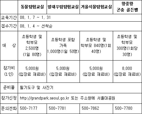 4일부터 서울대공원 홈페이지(grandpark.seoul.go.kr)서 참가자 접수 겨울방학, 춥다고 방 안에만 있으려는 아이들과 함께 동물원나들이를 떠나보는 건 어떨까. 서울대공원에서는 방학을 맞은 초등학생과 학부모를 대상으로 체험프로그램을 운영한다. 프로그램은 동물탐험교실, 열대우림탐험교실, 겨울식물 탐험교실, 겨울방학 왕중왕 곤충 골든벨 등 총 4가지가 운영될 예정. '동물탐험교실'에서는 동물들의 소화기관에 대한 궁금증을 해소하고 다양한 사슴을 배우고 만져볼 수 있다. '열대우림탐험교실'에서는 열대우림지역의 환경과 동물들을 관찰하는 시간을 갖는다. 또 뱀의 허물과 똥, 오줌 등을 직접 만져 보고 관찰할 수 있다. 세계 열대식물과 추위를 이겨내며 살아가는 식물들의 이야기가 궁금하다면 '겨울식물 탐험교실'에 참여해 보는 것이 좋겠다. 오후 야외 식물원에서는 장대를 이용한 쿵쿵따놀이와 박쥐나방놀이, 의자놀이, 인디언 분장놀이, 짚을 이용한 만들기 놀이 등 재미있고 신나는 겨울철의 놀이를 즐길 수 있다. 마지막으로 '겨울방학 왕중왕 곤충 골든벨'. 퀴즈를 통해 곤충들의 지혜를 알아보고, 물방개 경주대회와 곤충들의 배틀경기 등을 구경할 수 있다. 준비물은 필기도구와 사진기, 참가비는 재료비 등이 포함된 가격으로 1인당 5천원~8천원선이다. 접수기간은 1월 4일부터 선착순까지로 접수는 서울대공원 홈페이지(grandpark.seoul.go.kr)에서 인터넷으로 진행된다.