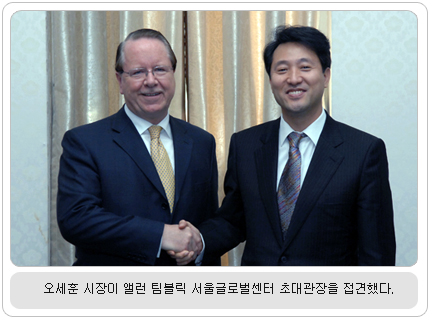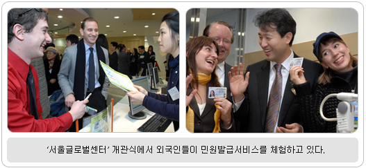 초대관장에 앨런 팀블릭씨 임명 의사소통도 잘 안 되는 상태에서 외국인들이 휴대전화를 개설하거나 신용카드를 발급받기란 하늘에 별따기. 인터넷 홈페이지에 가입하려니 주민등록번호를 입력해야 한다니, 낯선 외국인들이 서울에 살기에는 넘어야 할 장벽들이 너무나 많다. 서울시가 외국인들에게 ‘원스톱 민원 서비스’를 제공하기 위해 설립하는 기구인 ‘서울글로벌센터’가 23일 공식 개관했다. 23일 오후 2시30분에 열린 개관식은 오세훈 서울시장, 박주웅 서울시의회 의장, 심일보 SBA 대표이사와 주한외국대사들, 외국기업 주한상공회의소 대표, 서울시 외국인투자유치자문회의(FIAC) 의원들, 외국인학교장과 함께 앞으로 글로벌센터 운영에 협조하게 될 중앙정부 부처장 등 50여명이 참석한 가운데 개최되었다. 또 KBS TV 프로그램 ‘미녀들의 수다’의 출연진 10여명이 총출동하여, 서울살이의 힘들었던 점을 이야기하고, ‘서울글로벌센터’의 편리한 서비스를 체험해 보았다. 오세훈 서울시장은 이 자리에서 “서울글로벌센터가 외국인 및 투자기업에게 실질적인 도움이 되는 것은 물론 서울글로벌화 사업의 중추 기점이 되어야 한다”고 강조했다. 이어 센터를 찾은 외국인을 위해 운전면허증과 출입국증명서 발급을 직접 시연하고 전달했다. 개관식에 앞선 오전 10시 오세훈 서울시장은 서울시청 본관3층 시장접견실에서 글로벌센터 초대관장으로 임명된 앨런 팀블릭(65ㆍ영국) 센터장과 접견하고, 서울거주 외국인 불편 해소방안, 외국 커뮤니티와의 유대강화 등에 대한 논의와 함께 센터의 운영 활성화를 당부했다.