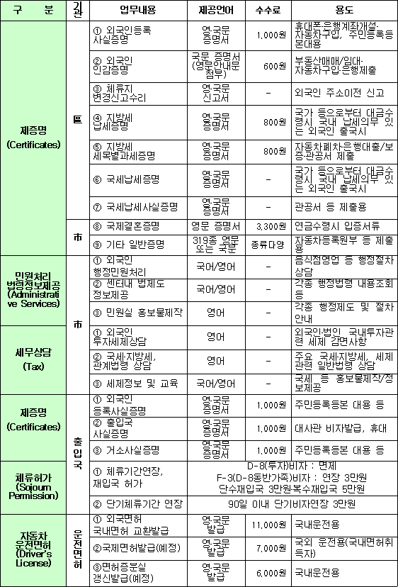 신용카드 발급, 휴대폰 가입 손쉬워진다 서울 태평로 한국프레스 센터 3층에 위치한 서울글로벌센터는 외국인들의 서울살이, 외국투자기업의 원활한 비즈니스를 돕기 위한 토털 서비스 센터로, 영어, 일어, 중국어, 프랑스 등에 능통한 전문인력 30여명이 상주하면서 각종 생활서비스를 다국어로 제공한다. 세부적으로 보면, ▲ 민원증명발급, 관광안내, 출입국 관련업무 등의 행정지원 ▲ 투자상담 등 외국인 비즈니스 지원 ▲ 글로벌화사업 기획·시행·관리 ▲ 외국인 생활지원 ▲ 외국인 근로자·결혼이민자 가정 지원사업 ▲ 국제교류, 다문화 존중사업 등 다양한 역할로 외국인 및 투자기업의 손과 발의 역할을 해낼 예정이다. 이에 따라 외국인 생활불편 사항으로 손꼽혔던 신용카드 발급, 휴대폰 가입이 손쉬워진다. 다국어 전화상담 서비스, 외국어로 고지서·납부서 발급 그런가 하면 평일 오전 9시부터 오후 6시까지는 전화로 직접 다국어 상담서비스를 제공하고, 업무시간 이후에는 ARS 콜백 서비스를 이용해 다음날 즉시 답변을 줄 수 있다. 다산콜센터(국번없이 120)와 연계하여 수도 등 공공서비스와 관련된 다국어 서비스도 개시할 예정이다. 이를 통해 비즈니스, 일상생활, 관광 레저, 취업, 외국인 커뮤니티, 온라인 문의상담 코너, 외국인근로자 지원, 발간자료 등을 제공하며, 4월부터는 교육과 주택·부동산 정보, 시내버스 및 지하철 노선 등 교통정보, 각종 문화공연과 경제 정보도 담을 예정이다. 6월부터는 외국인이 밀집 거주하는 지역에 대해 주민세, 자동차세, 재산세, 수도 등 주요생활 민원에 밀접한 고지서 및 납부서를 다국어로 발급한다. 대상지역은 연남ㆍ연희동, 이촌동, 서래마을, 이태원 등이다. 문의 : 서울시 경쟁력강화본부 경쟁력정책담당관 ☎ 2171-2296