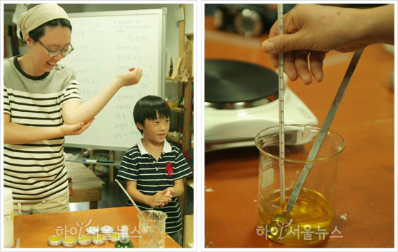 "아, 그럼 그렇게 식혀서 50℃ 아래로 내려가면 라벤더 다섯 방울, 티트리 열 방울 정도 넣어주세요. 향에 민감하신 분들은 좀 적게 넣어줘도 됩니다. 피부안정과 치유에 도움이 되는 허브에센스들이니 취향대로 가감해서 넣어줘도 됩니다."