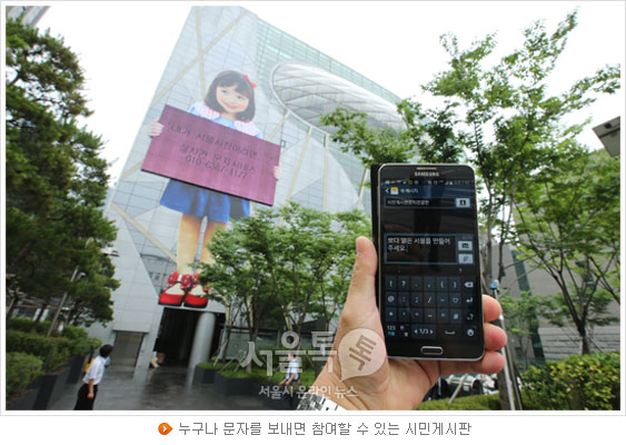 [서울톡톡] 서울시는 신청사 외벽(덕수궁 건너편)에 이색 문자전광판 '시민게시판'을 20일(금)부터 운영한다고 밝혔다. 시민게시판은 SMS(단문자 서비스) 표출기술을 활용한 새로운 신문고 서비스다.