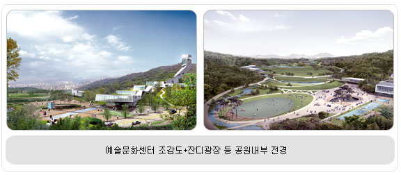 국제현상공모 통해 ‘씨토포스(국내)+IMA(미국)’의 작품 선정 강남북 격차를 해소하고, 강북 지도를 획기적으로 바꾸게 될 강북 최초의 90만㎡ 대형녹지공원의 마스터플랜이 발표됐다. 서울시는 국제현상공모를 통해 국내 조경업체인 (주)씨토포스와 미국 조경설계회사 IMA Design이 컨소시엄을 구성해 응모한 작품을 당선작으로 선정했다. '개방(Open Field)'을 주제로 한 당선작은 노후된 드림랜드를 모두 비워내고, 녹지공간과 다양한 물줄기가 그물망을 이루는 경관을 표현하고 있다. 이 작품은 국제심사위원단으로부터 “채움보다는 비움을 통해 공간의 잠재성을 확보함으로써 불확실한 도시의 변화에 대응하는 ‘도시의 여백’을 잘 표현한 수작”이라는 평가를 받았다. 설계안에 의하면, 공원 규모의 약 1/3에 이르는 드림랜드 부지 가운데 경사지 인공지형인 눈썰매장은 전망타워와 소공연장 등의 테라스 형태 문화공간으로, 창녕위궁재사(등록문화재 제40호) 주변은 푸른호수와 월광폭포 등 생태문화공간으로 다시 태어난다. 또한 도로(오현로)에 의해 단절됐던 공원을 에코터널로 연결해 동·식물과 인간의 교류가 가능한 흐름과 소통이 있는 공간으로 조성한다. 공간배치는 경계부ㆍ접속부ㆍ결절부ㆍ중심부로 나누어 환경·문화 아이템을 배치, 중심 집중이 아닌 모든 공간을 활용하도록 했다. Small Edge(경계부)는 포켓파크, ID플라자, 쌈지마당, 가로공원 등으로 조성되고, Medium patch(접속부)는 기존 산책로와 체육시설 등을 연결한 중규모 공간으로서 어린이 놀이공간, 체력단련장 등을 연계 배치한다. Large Node(결절부)는 공원이용프로그램의 핵심공간으로 이벤트플라자, 아트갤러리 등 문화참여 시설을 설치하고, 중심부(X-Large Field)는 이벤트와 축제 등의 활동이 가능하도록 비워진 공간으로 구성한다. 설계안은 공원에 들어설 건물을 지하1층·지상1층의 문화센터, 지상2층의 아이콘 미술관, 지하1층의 옥외전시 및 카페테리아 등 시설물을 최소화해 녹지의 평온함을 극대화했다.