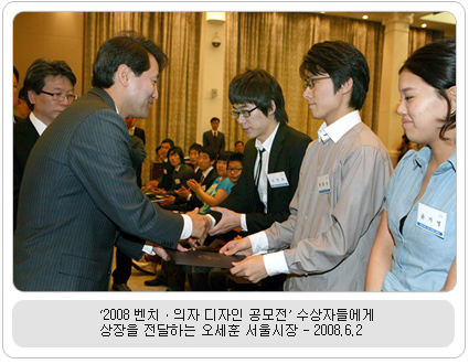 대상, 지정우 씨의 ‘벤치, 한강에서 숨을 쉬다’ 선정 2일(월), 서울시청 태평홀에서는 ‘2008 벤치·의자 디자인 공모전’ 에 대한 시상식이 진행됐다. 대상은 미국 건축사무소에 근무하는 지정우 씨의 ‘벤치, 한강 풍경에서 숨을 쉬다’가 차지했다. 이 작품은 이번 공모의 주제인 Design is Air에 가장 적절하게 부합되는 디자인으로, 자연친화적인 구조로 돼 있으며, 생태학적인 개념을 현대적인 감각으로 표현해 심사위원 모두에게 우수한 작품이라는 평가를 받았다. 수상자에게는 서울시장상과 함께 대상 5백만원, 금상 각 3백만원, 은상 각 1백만원, 동상 각 30만원, 입선 각 10만원의 상금이 수여됐다. 오세훈 시장은 인사말을 통해 “올해는 지난해의 2배 가까이 되는 917점(학생 765, 일반인 144, 외국인 8)의 창의적 아이디어가 쏟아졌다”며, “서울시는 이를 실제 거리에 적용토록 하여, 시민과 함께 만드는 디자인 서울이 되도록 할 것”이라고 밝혔다. 아울러 서울시는 우수작품에 대한 선별과정을 거쳐 2008년10월 10일부터 30일까지 잠실운동장에서 개최되는 ‘서울디자인올림픽 2008’의 행사장에 수상작을 실물로 제작 전시할 계획이다. 그에 앞서 서울광장에서는 오는 6월 5일(목)까지 ‘2008 벤치·의자 디자인 공모전’의 수상작 이미지가 전시된다. 하이서울뉴스/조선기 |