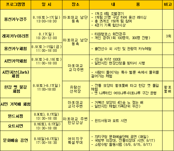 드래곤 보트를 타고 신나는 경주!…한강카누축제 시민 누구나 참여할 수 있는 7일간의 카누체험과 이틀 동안 펼쳐지는 용선ㆍ카누대회가 펼쳐진다. 시민카누체험은 매일 11시부터 저녁 6시까지 현장신청을 통해 15분 정도 교육을 받은 후 멋진 카누 체험을 무료로 할수 있는 프로그램이다. 8월 9~17일, 오전11시부터 오후 6시까지, 여의지구 마포대교 남단.