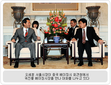 오세훈 서울시장, 2008 베이징 올림픽 개막식 참석 전 세계인의 이목이 집중된 베이징 올림픽이 성대한 개막식과 함께 시작됐다. 도쿄와 서울에 이어 아시아에서는 세 번째로 열리는 이번 올림픽을 무대로 서울시는 다양한 도시 외교와 마케팅을 펼친다. 오세훈 서울시장은 자매도시인 베이징 시의 공식 초청으로 지난 8일 국가체육장(올림픽 주경기장)에서 열린 2008 베이징 올림픽 개막식에 참석했다. 이 자리에는 80개국 국가 원수와 정상, 베이징 시와 우호관계에 있는 22개 도시 시장들이 모여 스포츠를 통한 세계 화합을 다졌다. 또한 개막식에 앞서 개최된 리셉션에서 오세훈 시장은 베이징, 시카고, 마드리드, 도쿄 시장 등을 만나 내년 5월 서울에서 열리는 ‘C40 제3차 정상회의’와 오는 10월 개최되는 ‘서울디자인올림픽’에 초청하는 등 홍보활동을 벌였다. 서울-베이징 시 우호협력 … 서울디자인올림픽, C40 등 홍보 한편, 오세훈 시장은 9일 궈진룽 베이징 시장과 리우치 당서기를 각각 접견, 서울과 베이징 두 도시 간 관광, 경제, 무역, 투자유치 등 교류 확대 방안을 논의하기도 했다. 특히 올해는 서울시와 베이징 시 간 교류 15주년을 맞는 뜻 깊은 해. 지난 1993년 교류협력 강화에 관한 양해각서를 체결하고 자매도시를 맺은 이래 양 도시는 활발한 교류를 전개해 왔다. 오세훈 시장은 궈진룽 베이징 시장을 만난 자리에서 ‘서울디자인올림픽’에 대한 베이징 시의 지원과 협조에 감사의 인사를 전하고, ‘C40 제3차 정상회의’에 참석해 환경과 기후 변화 대응에 대한 우수사례를 발표해 줄 것을 당부했다. 베이징 시는 현재 ‘서울디자인올림픽’에 참가를 확정했으며 참가 방식 등을 논의 중이다. 리우치 당서기와 접견한 자리에서는 동북아 발전과 세계 평화를 위해 한국과 중국의 협력이 매우 중요하다고 강조하고, “서울시가 베이징 시가 양국 발전의 토대가 될 수 있도록 상호 협력하는 좋은 파트너가 되길 바란다”고 밝혔다.